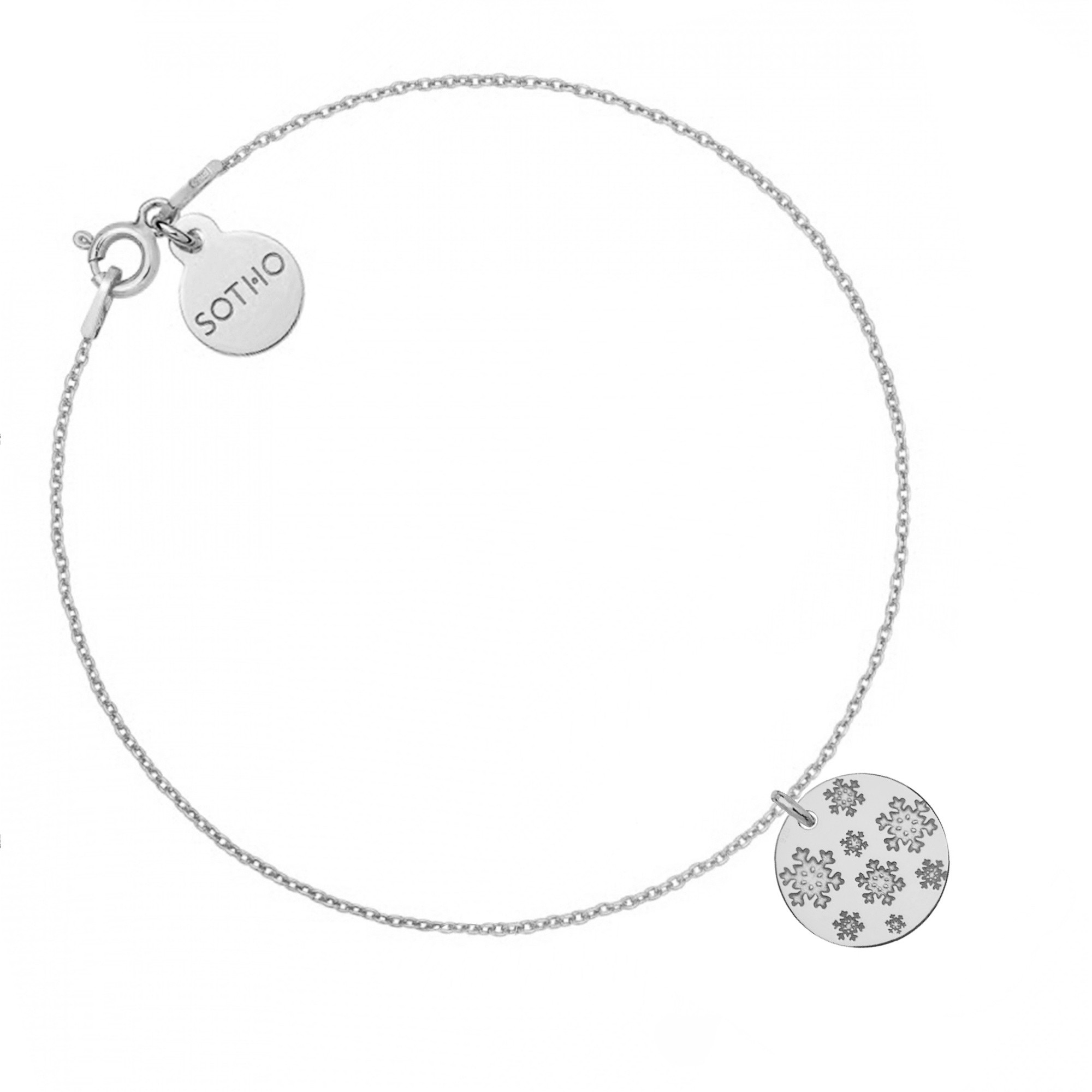 Srebrna bransoletka łańcuszkowa zdobiona zawieszką z grawerowanymi śnieżynkami i zawieszką z logo marki. Całość wykonana ze srebra 925.