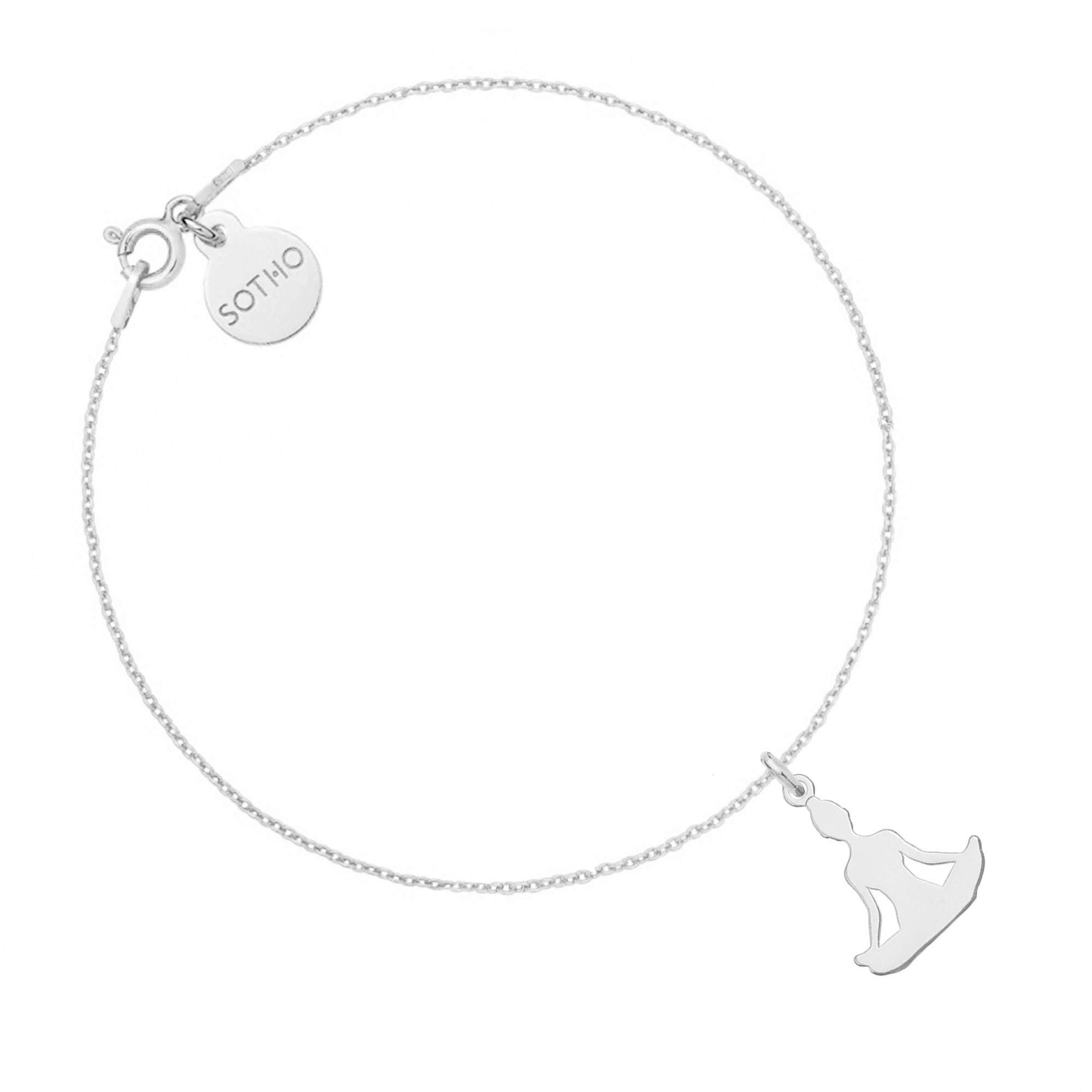 Srebrna bransoletka łańcuszkowa zdobiona joginką w pozycji kwiatu lotosu i zawieszką z logo marki. Całość wykonana ze srebra 925.