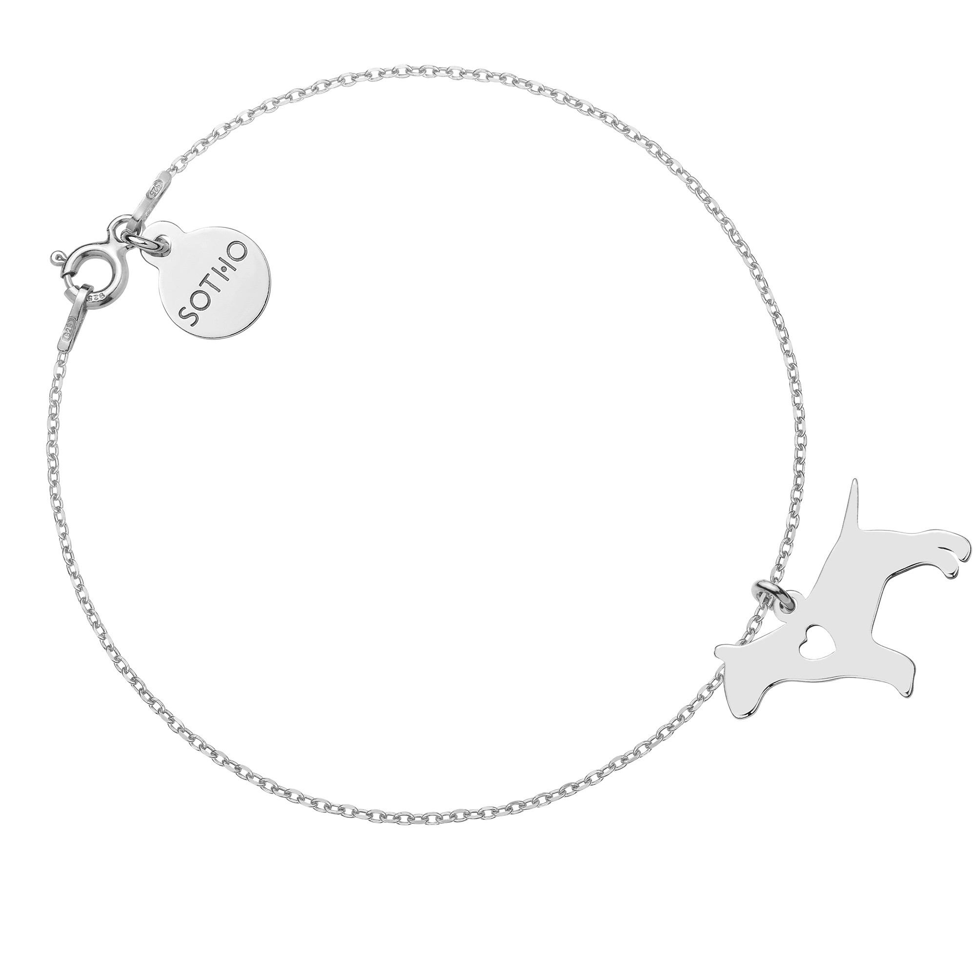 Srebrna bransoletka łańcuszkowa zdobiona zawieszką z psem rasy bulterier i zawieszką z logo marki. Całość wykonana ze srebra 925.