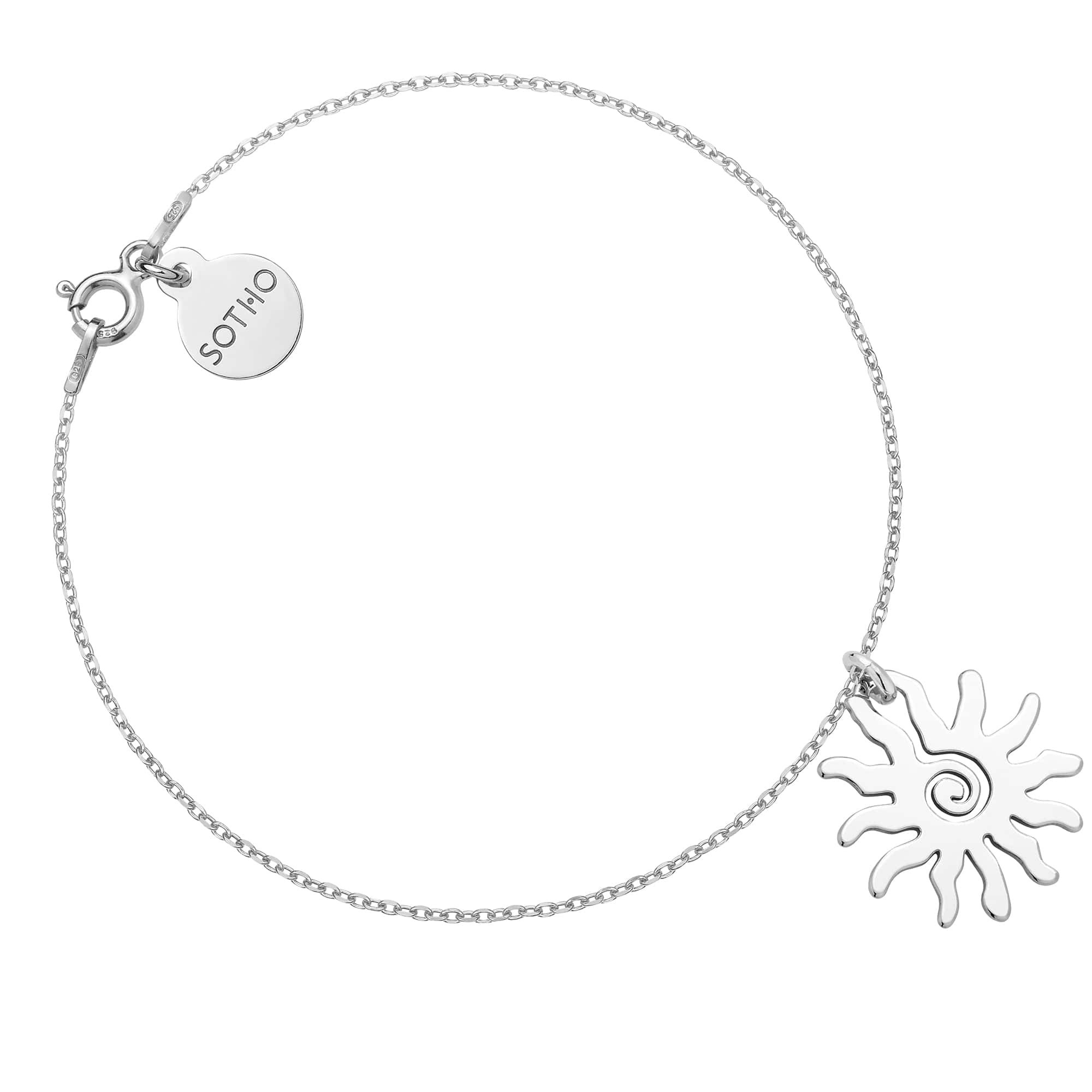 Srebrna bransoletka łańcuszkowa zdobiona słońcem i zawieszką z logo marki. Całość wykonana ze srebra 925.