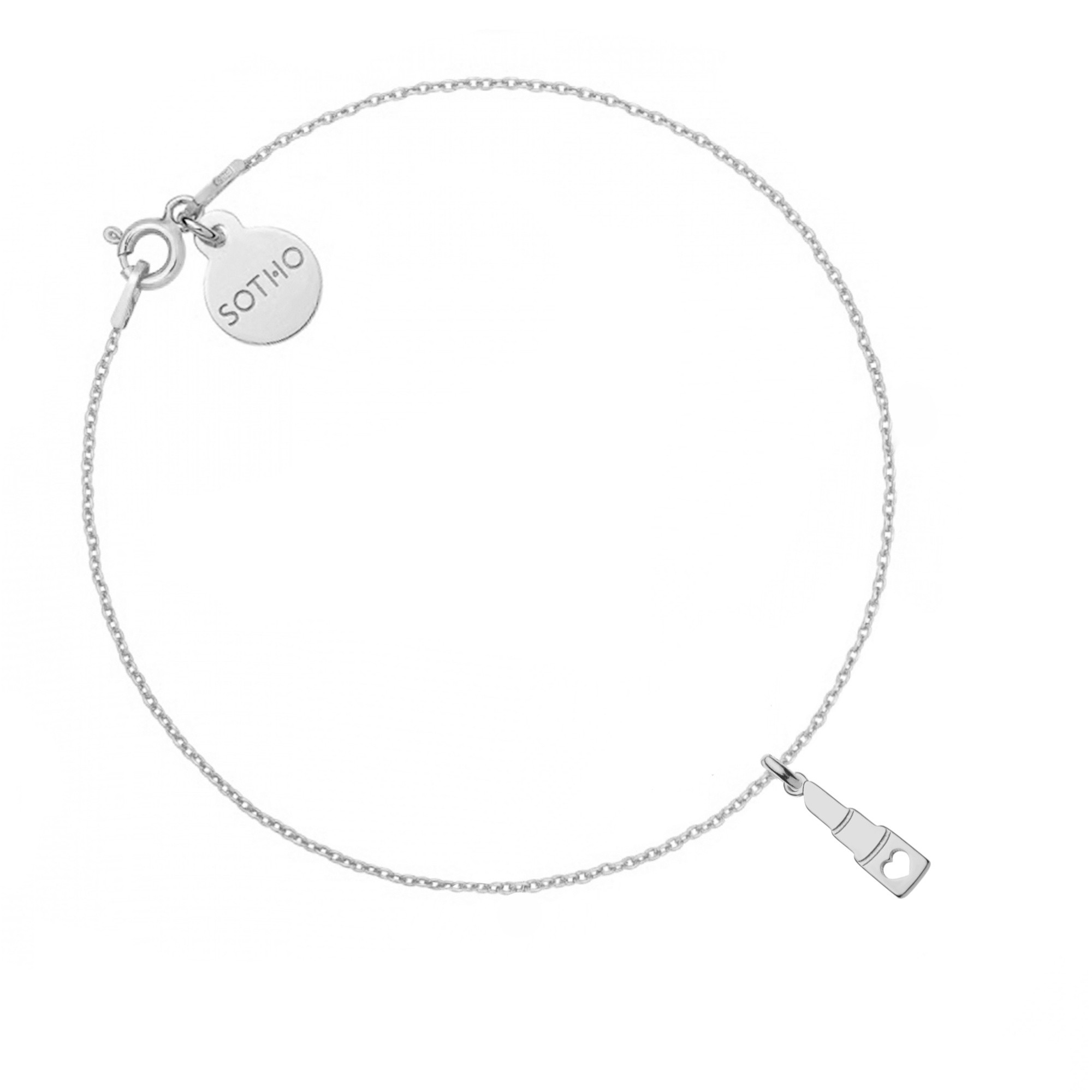 Srebrna bransoletka łańcuszkowa zdobiona szminką i zawieszką z logo marki. Całość wykonana ze srebra 925.
