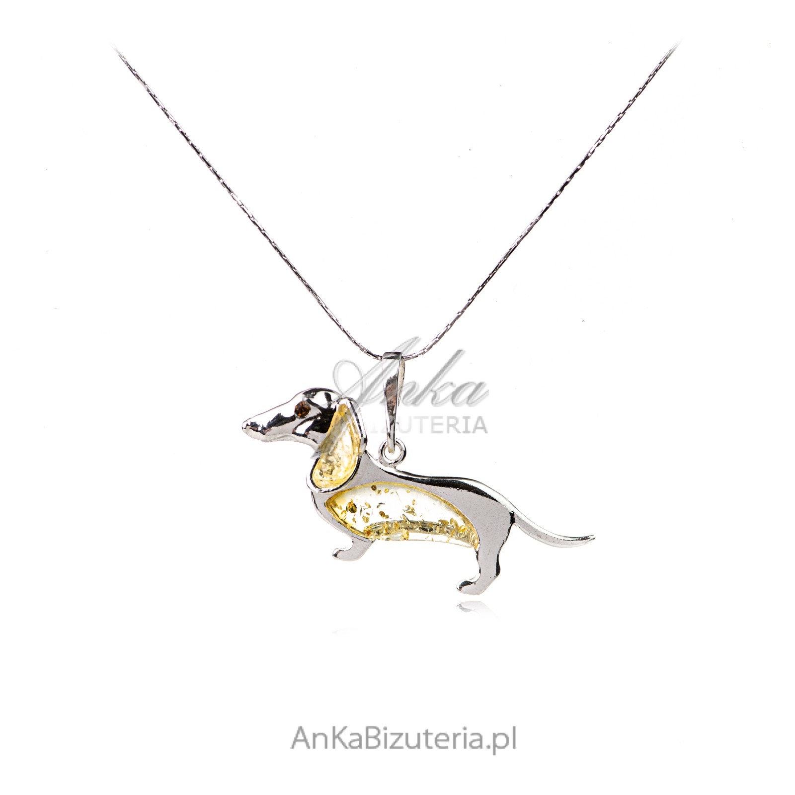 Piękna zawieszka z żółtym bursztynem – jamnik.