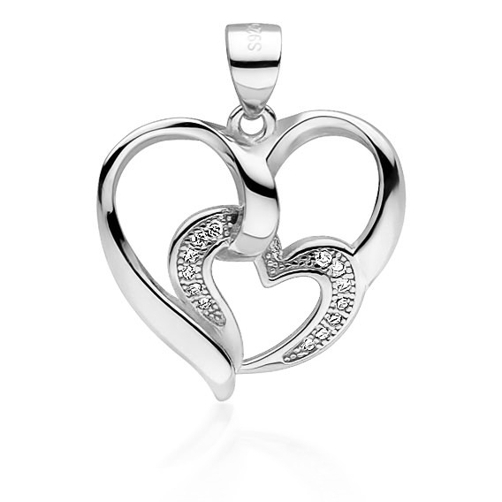 Srebrna zawieszka z małym sercem w sercu duzym z cyrkoniami