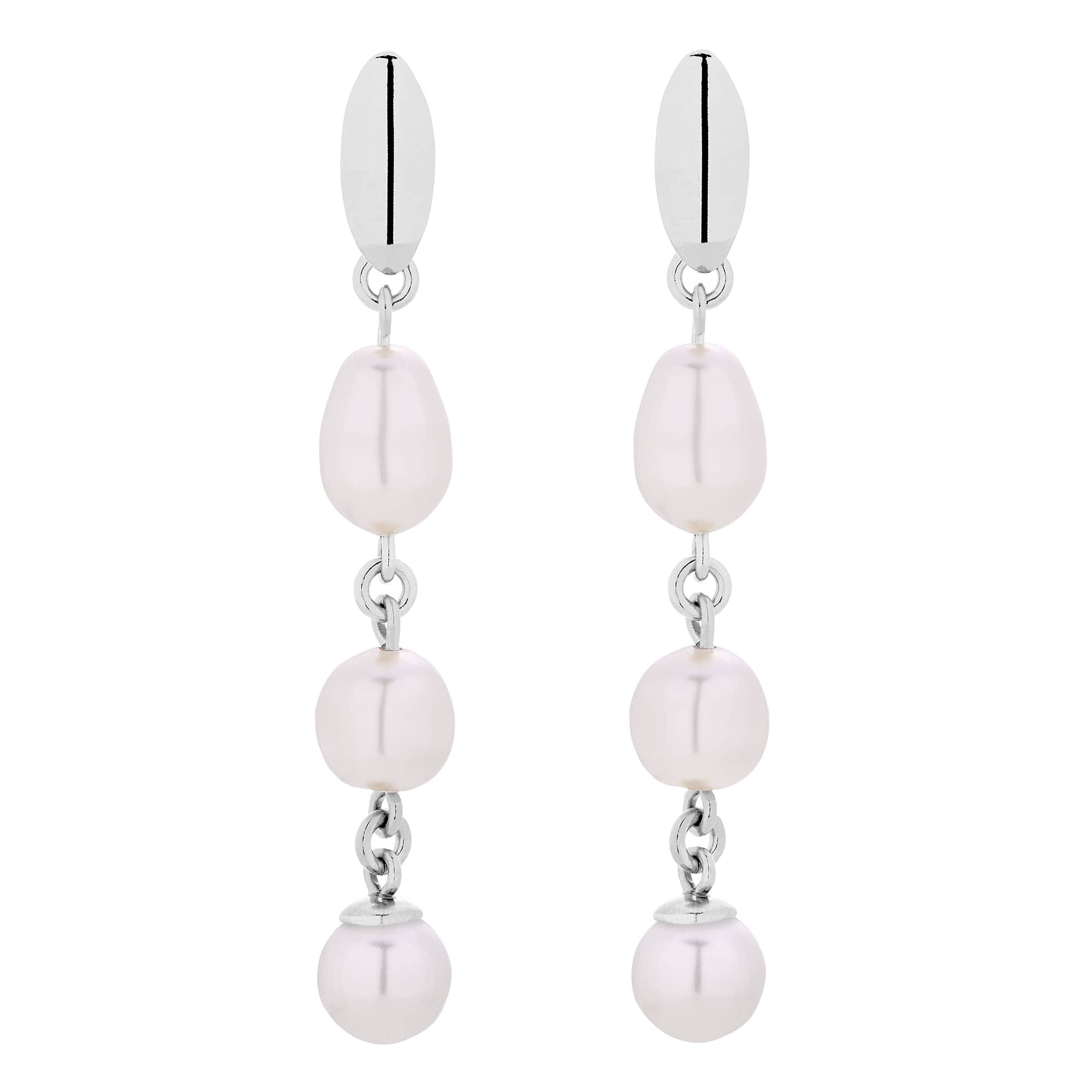 Srebrne długie kolczyki z perłami SWAROVSKI® CRYSTAL w kolorze białym White. Zapinane na sztyft. Kolczyki posiadają zapięcia (baranki). Całość wykonana ze srebra 925.