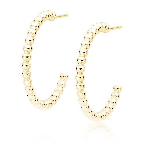 Srebrne kolczyki wykonane ze srebra próby 0,925 pozłacane warstwą żółtego złota w kształcie otwartych kół z łączonych kuleczek. Oryginalne kolczyki będą modnym dodatkiem na wiele okazji.