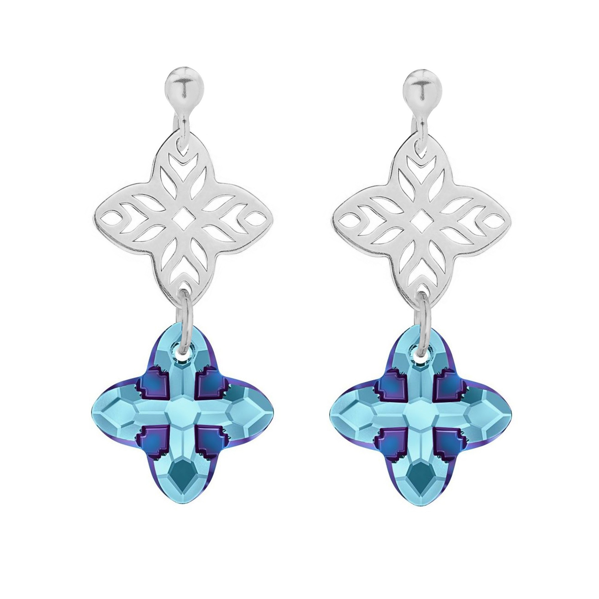 Srebrne kolczyki wykonane z rozetek oraz dwustronnym kryształem SWAROVSKI® CRYSTAL w dwóch kolorach wóch kolorach Aquamarine i Metallic Blue .Całość wykonana ze srebra 925.Zapinane na sztyft.
