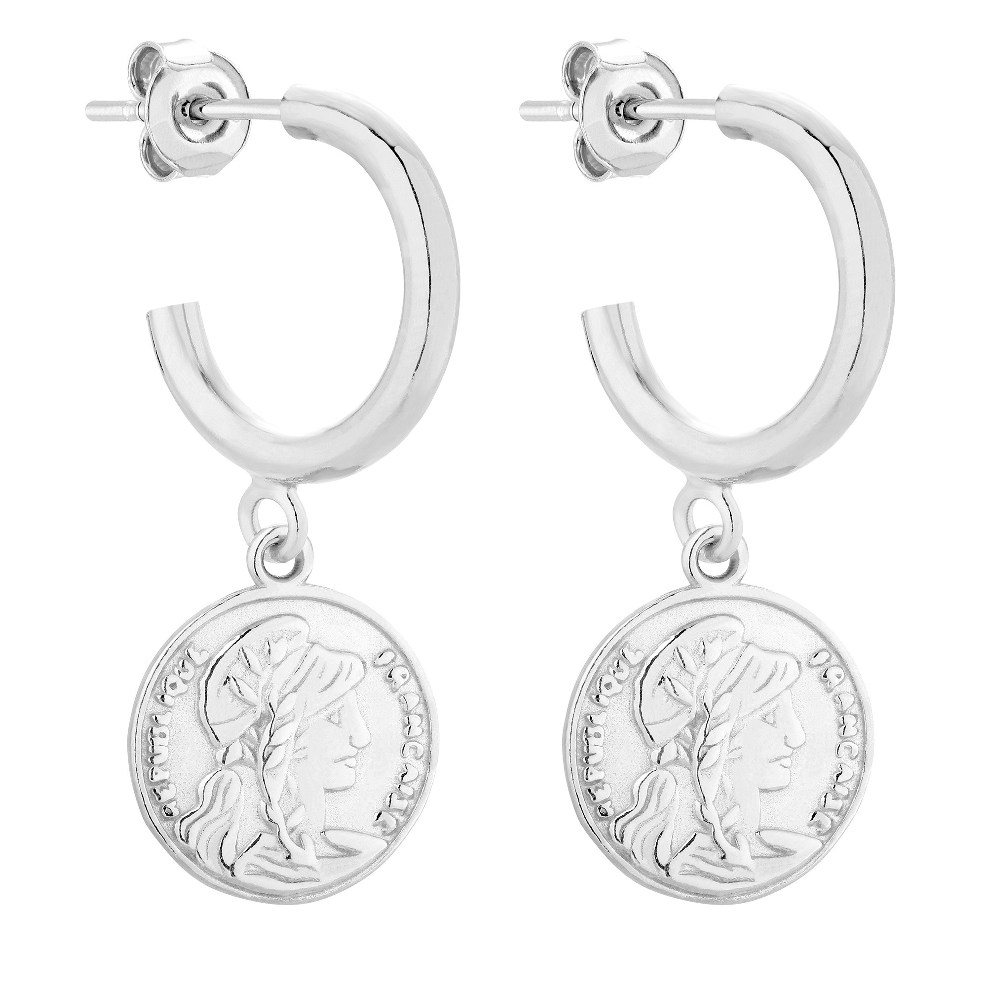Grube, półokrągłe, srebrne kolczyki z monetami. Całość wykonana ze srebra 925.