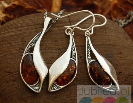 Gustowny, srebrny komplet(kolczyki i wisior), w którego podłużny motyw zdobniczy wkomponowany został naturalny koniakowy bursztyn.