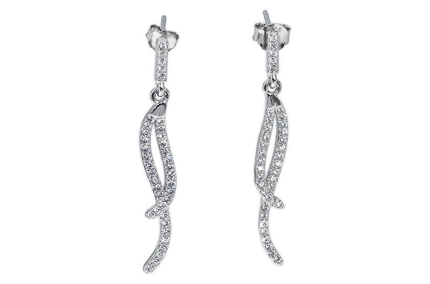Piękny srebrny komplet z cyrkoniami. Kolczyki i wisiorek wykonane są z rodowanego srebra próby 925. Rodowanie zabezpiecza srebro przed reakcją z zanieczyszczeniami w powietrzu, dzięki czemu można się cieszyć pierwotnym pięknem koczyków i wisiorka przez bardzo długi czas. Kolczyki i wisiorek pięknie połyskują srebrnym i diamentowym blaskiem. Dodatek z pewnością nada powabu i szyku niejednej eleganckiej kreacji. Stworzony został z myślą o kobietach ceniących wysmakowaną i stylową biżuterię.