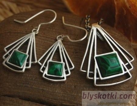 Niespotykany zestaw (kolczyki oraz wisior) srebrnej biżuterii. Stylistyka tego wyrobu to esencja uwielbienia symetrii kształtów. Całość doskonale uzupełniają malachity (syntetyczne).