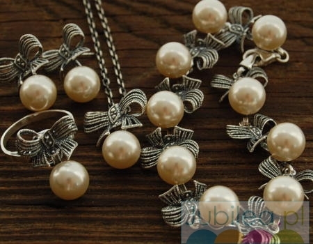 Przedstawiamy niepowtarzalny srebrny komplet w składzie (kolczyki, wisiorek, pierścionek oraz bransoletkę) inspirowany jubilerstwem wiktorianskiej Anglii. Srebrna ażurowa kokarda to motyw przewodni biżuterii, a jego uwieńczeniem jest perła (synt)