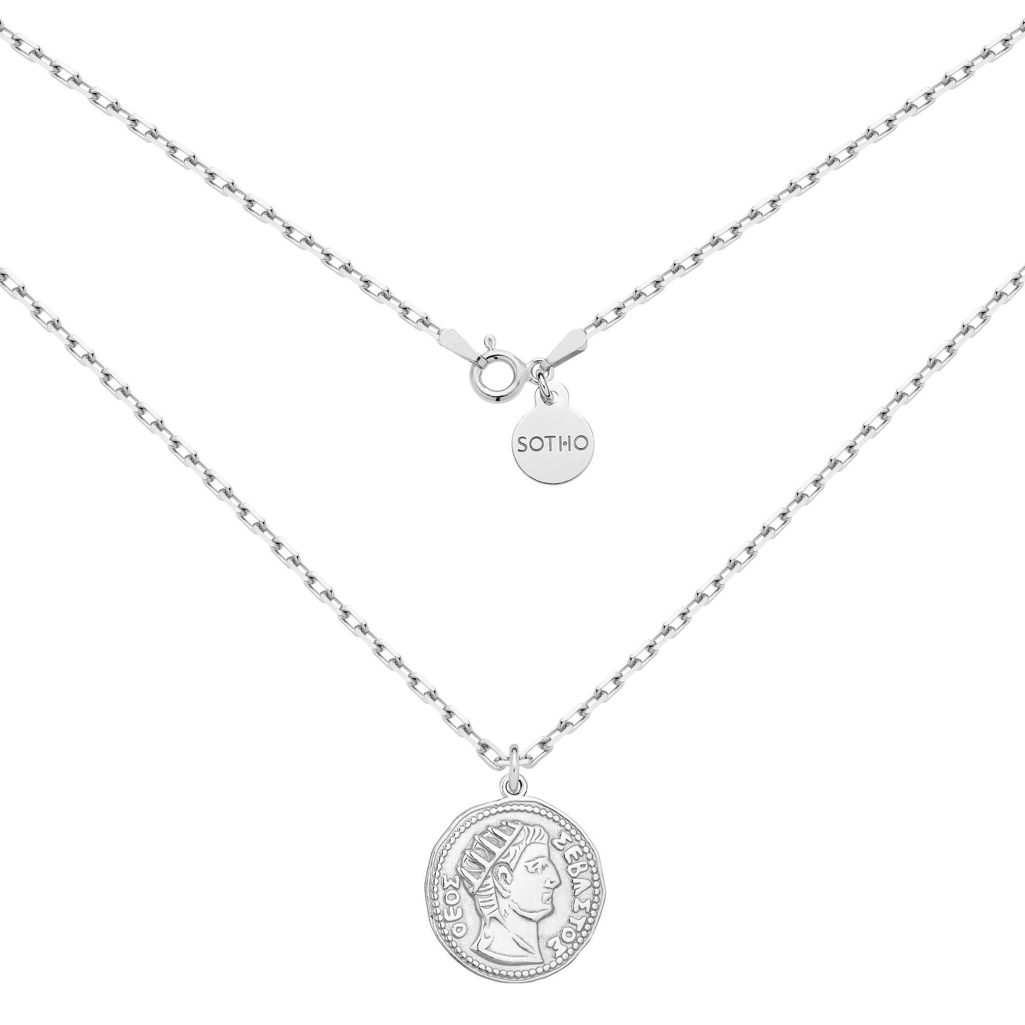 Srebrny masywny łańcuszek z dużą monetą oraz zawieszką z logo marki.