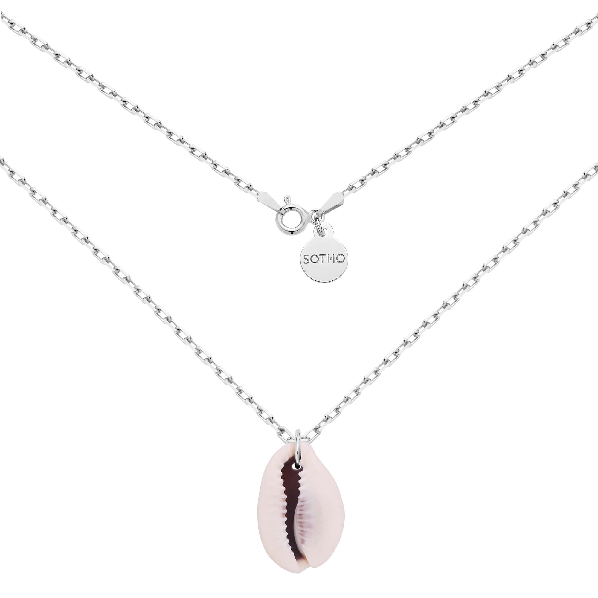 Srebrny masywny łańcuszek z muszelką oraz zawieszką z logo marki. Całość wykonana ze srebra 925.