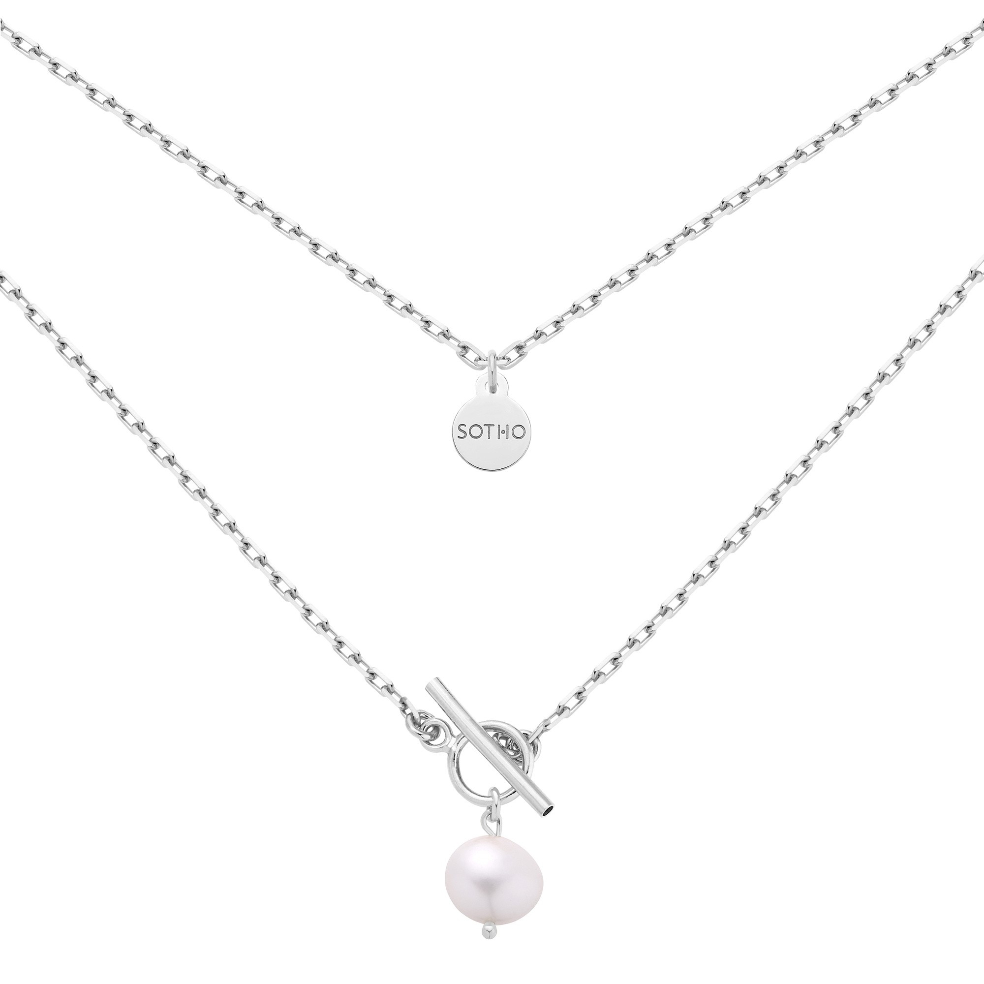 Srebrny naszyjnik z ozdobnym zapięciem i naturalna słodkowodną perłą i zawieszką z logo marki. Całość wykonana ze srebra 925.