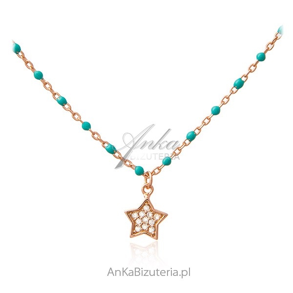 Srebrny naszyjnik próba 925 pozłacany różowym złotem z turkusową emalią i cyrkoniami