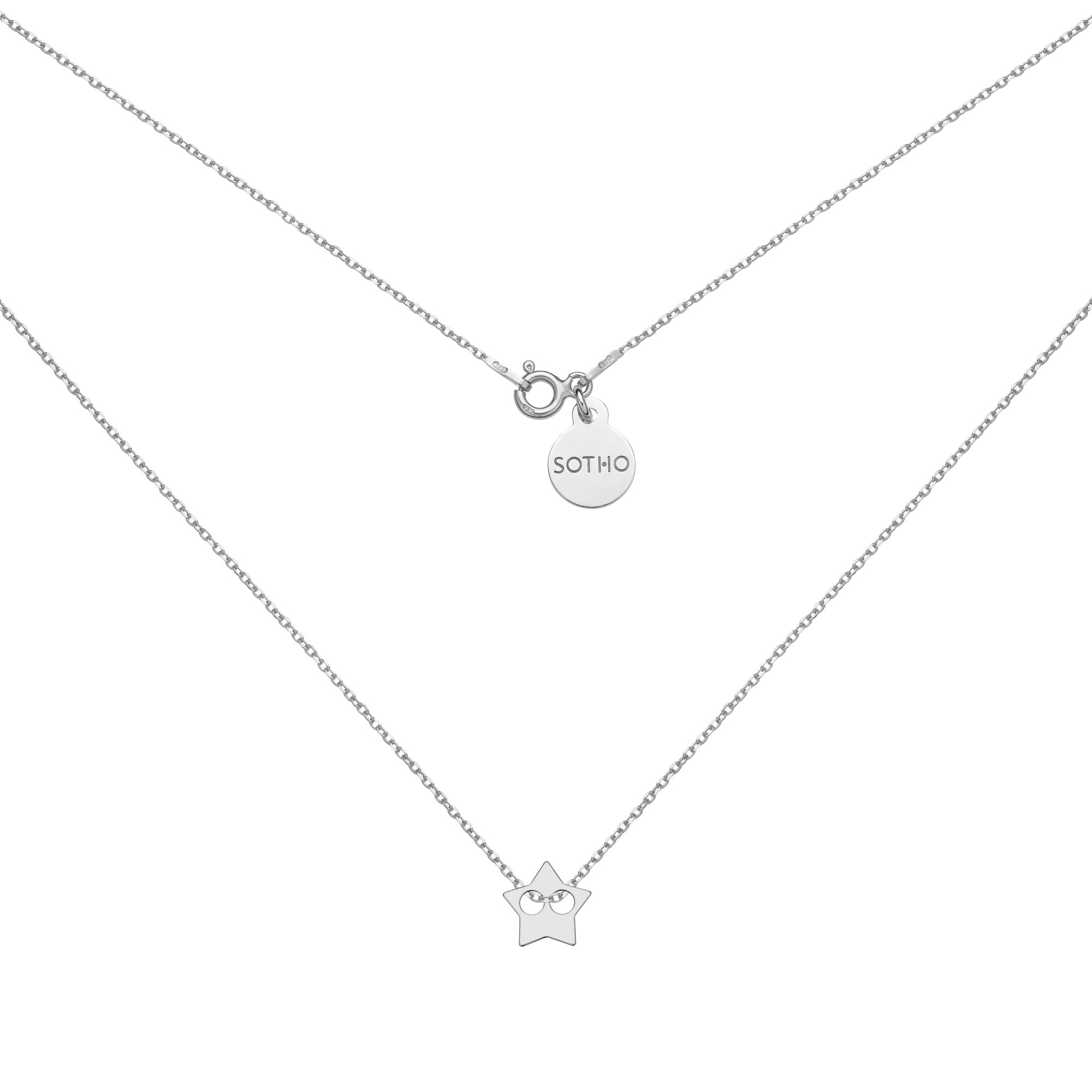 Srebrny naszyjnik łańcuszkowy zdobiony gwiazdką i zawieszką z logo marki. Całość wykonana ze srebra 925.