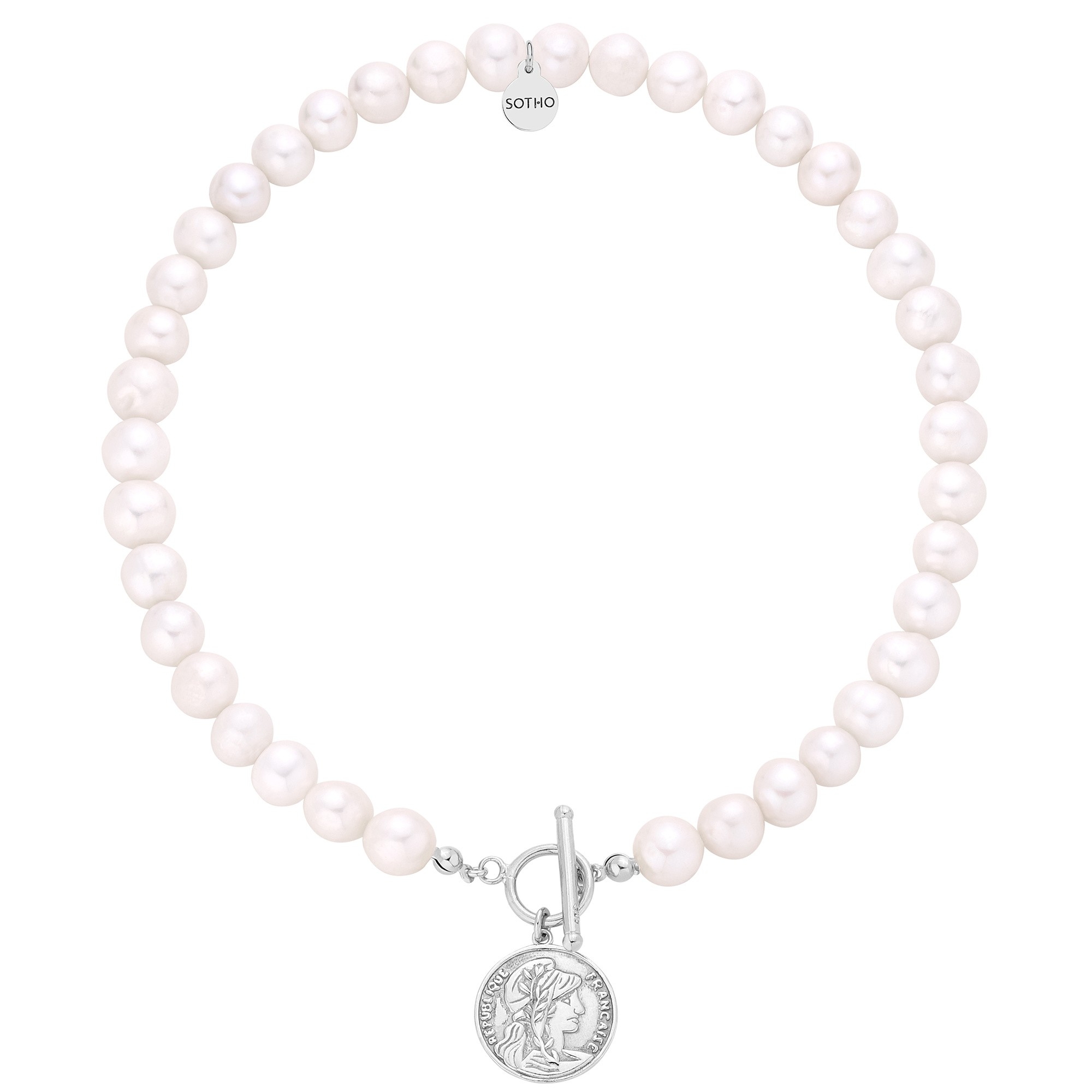 Naszyjnik z monetą wykonany z naturalnych pereł słodkowodnych, zdobiony zapięciem i logo marki. Wszystkie elementy wykonane ze srebra 925. Perły są nieregularne, unikatowe, delikatnie różnią się od siebie i mogą różnić się od tych na zdjęciu.