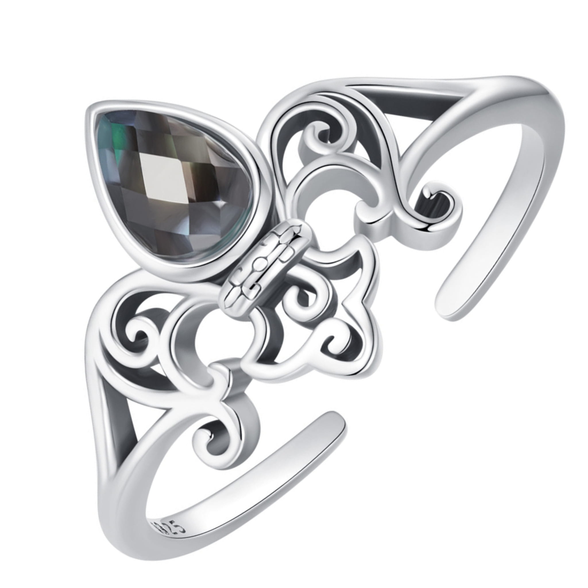 Srebrny regulowany pierścionek irys ozdobiony kryształem. Pierścionek uniwersalny wykonany ze srebra 925. rozmiar/średnica: R16/17,7mm możliwa regulacja: od R14/17,0mm do R18/18,3mm materiał: srebro 925 kolor kryształów: opalizujący kształt/motyw: irys grubość pierścionka: 1,2 mm waga pierścionka: 1,8 g marka: SilverBeads model: P140U Symbolika pierścionka. Pierścionek inspirowany delikatną formą kwiatu irysa, subtelnie uchwycony w srebrze. Ażurowe płatki układają się wokół opalizującego kryształu w kształcie kropli, który zmienia barwy w zależności od światła. Irys symbolizuje intuicję, odnowę i duchową siłę. Ten projekt przyciąga uwagę wyjątkową formą i mistycznym blaskiem. Gratis eleganckie opakowanie. Pierścionek zostanie zapakowany w eleganckie pudełeczko prezentowe. Jeśli potrzebujesz dodatkowych pudełeczek lub woreczków satynowych znajdziesz je w naszej ofercie.