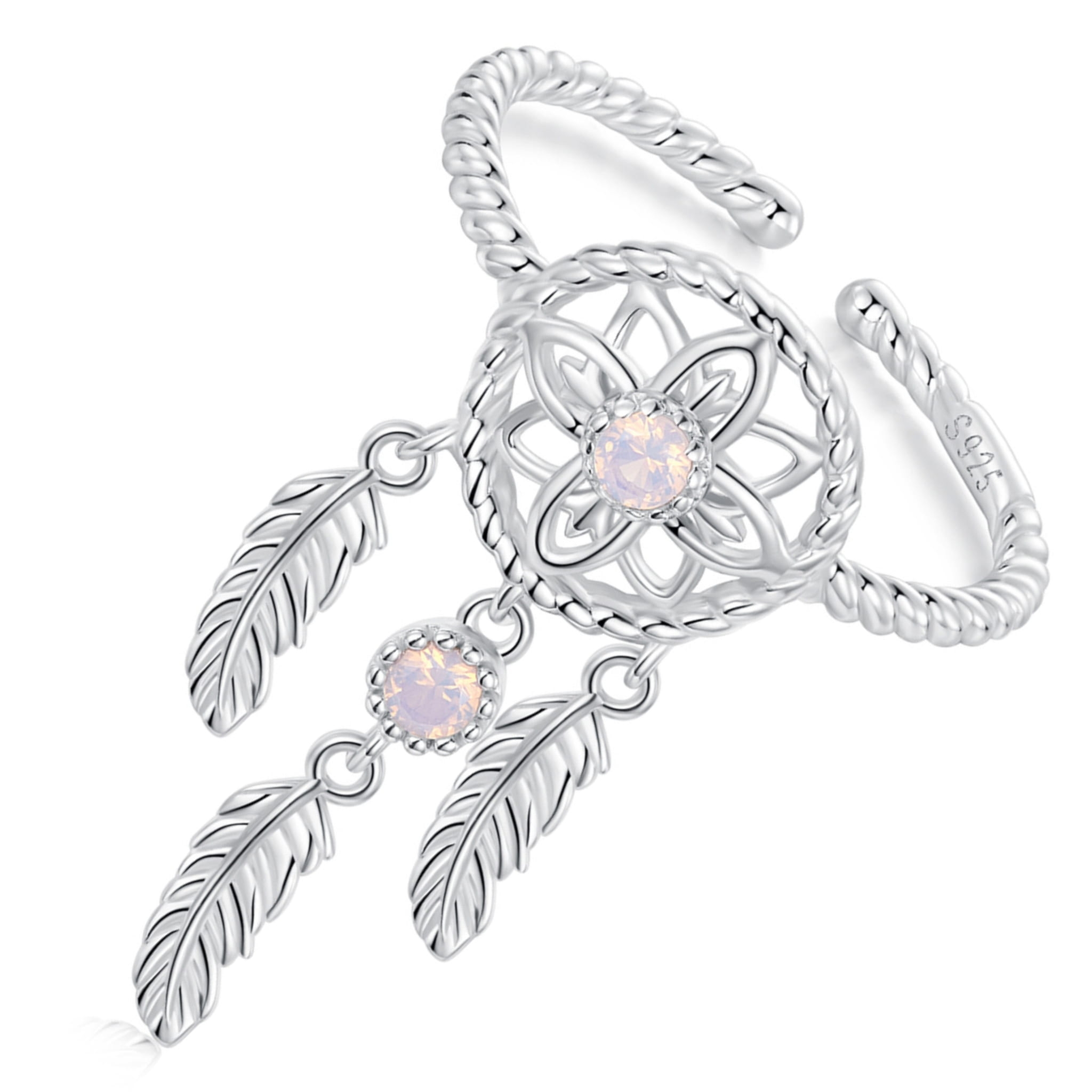 Srebrny regulowany pierścionek łapacz snów. Pierścionek uniwersalny wykonany ze srebra 925.  rozmiar/średnica: R16/17,7mm możliwa regulacja: od R14/17,0mm do R18/18,3mm materiał: srebro 925 kolor kryształów: opalizujące kształt/motyw: łapacz snów grubość pierścionka: 1,4 mm waga pierścionka: 2,1 g marka: SilverBeads model: P136U Symbolika pierścionka. Pierścionek inspirowany amuletem łapacza snów przywołuje motywy ochrony, spokoju i pozytywnej energii. Delikatna sieć z centralnym kamieniem symbolizuje filtrowanie myśli, a zawieszone piórka dodają mu lekkości i eteryczności. Spleciona obrączka podkreśla rękodzielniczy charakter projektu. To biżuteria, która łączy magię snów z symboliką duchowej harmonii. Gratis eleganckie opakowanie. Pierścionek zostanie zapakowany w eleganckie pudełeczko prezentowe. Jeśli potrzebujesz dodatkowych pudełeczek lub woreczków satynowych znajdziesz je w naszej ofercie.