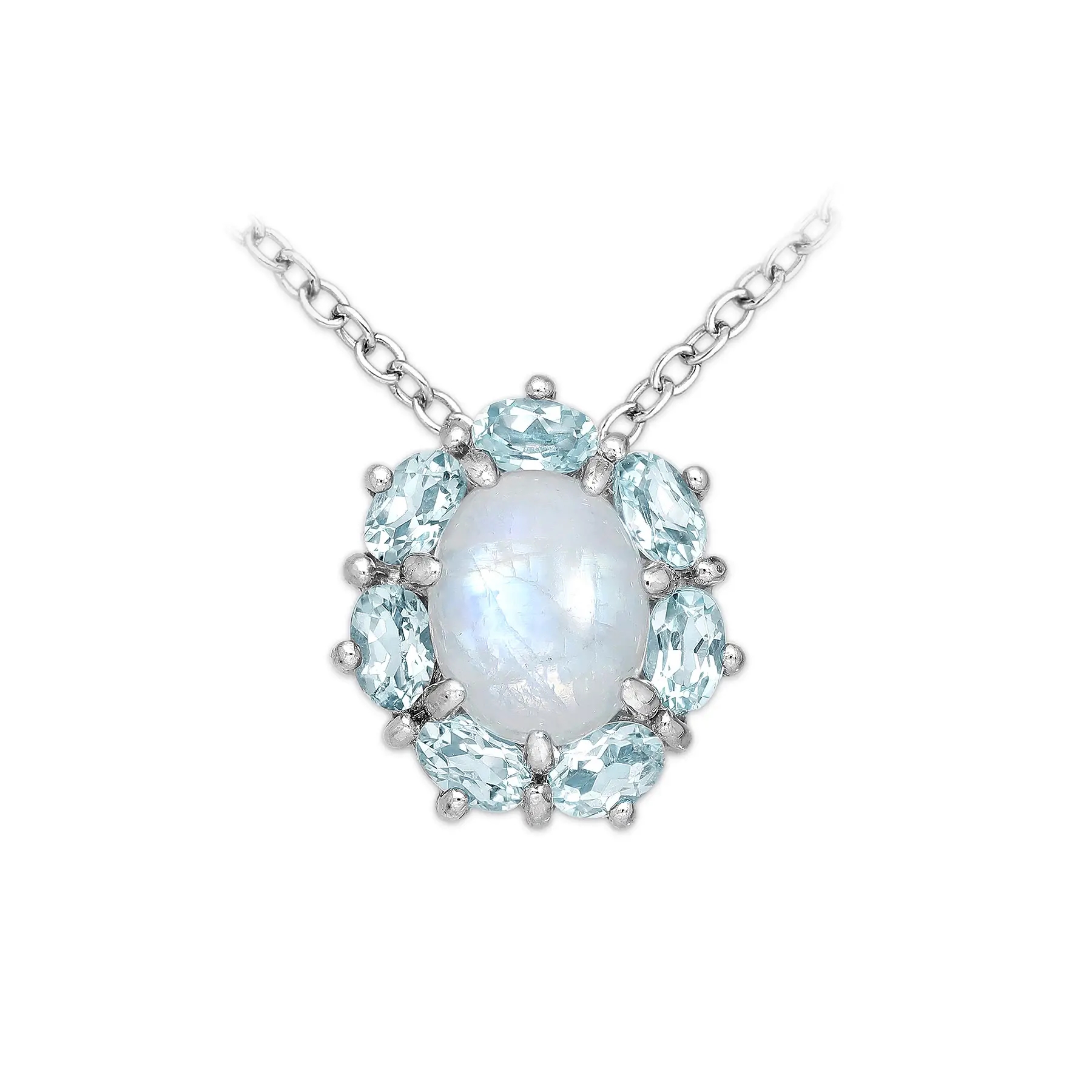 Uroczy wisiorek z naturalnym, pięknie wybarwionym kamieniem księżycowym i efektownymi topazami. Wykonany został z rodowanego srebra w najwyższej próbie 925. Szlachetny Rod zabezpiecza powierzchnię srebra przed reakcją z zanieczyszczeniami w powietrzu. Dzięki temu wisiorek będzie służył latami jak nowy. Jest elegancki, bardzo twarzowy oraz starannie wykonany. Dla Pań, które kochają naturalne kamienie.