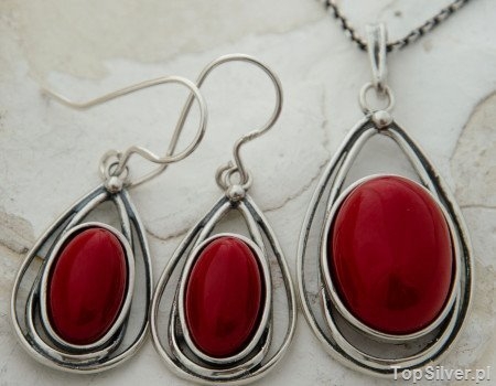 KOMPLET SREBRNEJ BIŻUTERII O PROSTYM, KLASYCZNYM WZORNICTWIE. W KSZTAŁT SREBRNEJ KORPLI WKOMPONOWANY ZOSTAŁ KORAL(synt).