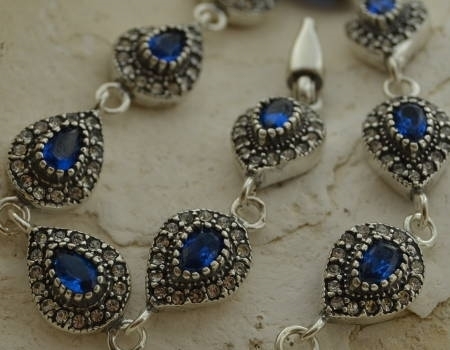 Prezentujemy niezwykle elegancką i piękną srebrną bransoletkę – składającą sie z dziesięciu ogniw. W każdym ogniwie zakuto szafirową łze, a wokół niej wkomponowano 15maleńkich cyrkonii. Całość robi niesamowite wrażenie.