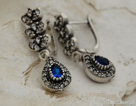 Prezentujemy niezwykle eleganckie i piękne srebrne kolczyki – w dekoracyjnej srebrnej gałązce wprawiono 15drobnych cyrkonii a pod spodem podwieszona srebrne oprawkę z szafirową łzą, wokół której wprawiono 15drobnych cyrkonii. Całość robi niesamowite wrażenie.
