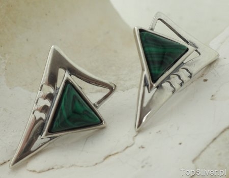 W centralnym miejscu kolczyka wkomponowany został trójkątny malachit (wymiary boku 1cm).