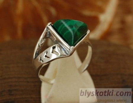 W centralnym miejscu pierścionka wkomponowany został trójkątny syntetyczny malachit (wymiary boku to 1cm).