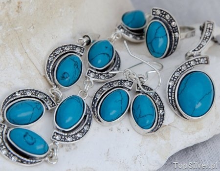 Wytworny zestaw srebrnej biżuterii, w którego oksydowane elementy wkomponowano turkusy, które zostało podkreślone poprzez kryształy Swarovskiego umieszczone na krawędzi.