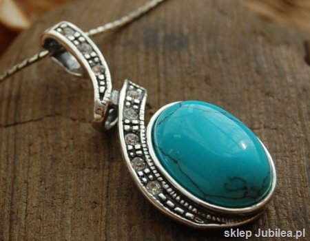 Wytworny wisior, w którego oksydowany wzór wkomponowano turkus, który został podkreślony poprzez kryształy Swaroskiego umieszczone na krawędzi.