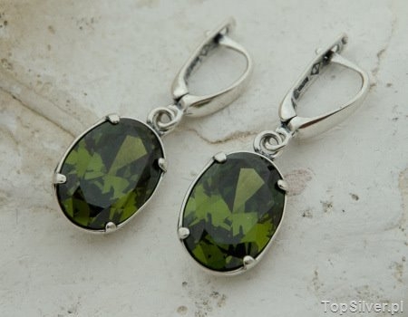 Delikatne, aczkolwiek bardzo eleganckie kolczyki, w których najważniejszą i najbardziej przykuwającą uwagę częścią jest mistrzowsko wyszlifowany oliwin (synt), zakuty w srebrną oprawkę.