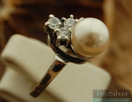 Wytworny, srebrny pierścionek- stylistyką nawiązujący do najpiękniejszego okresu dla jubilerstwa czyli secesji. Uwieńczeniem pierścionka jest perła oraz zakute nad nią 3cyrkonie. Biżuteria wykonana została z dbałośią o każdy szczegół.