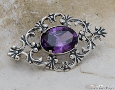 Stylowa brosza, która swój piękny wzór zawdzięcza rozkwitowi jubilerstwa w carskiej Rosji. W niepowtarzalny ornament wkomponowany jest ogromny ametyst 9syntetyczny).