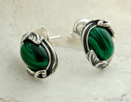 Srebrne kolczyki z malachitami. Kamienie zamknięte są w srebrnych oksydowanych oprawach, ozdobione dwoma listkami.