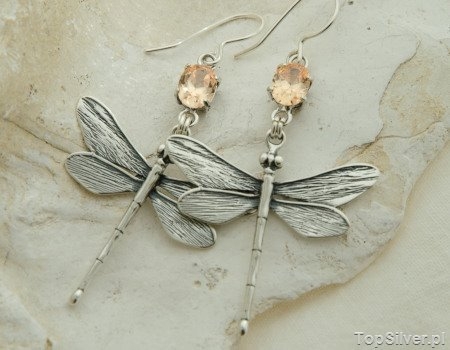 Srebrne kolczyki ważki – symbol secesji a także hit popularności. Ważka połączona została z pięknym topazem złocistym(synt) zakutym w srebrna oprawę.