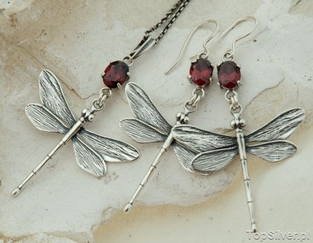 Srebrny komplet ważek – symbol secesji a także hit popularności. Ważki połączone zostały z pięknym granatem(synt) zakutym w srebrna oprawę.