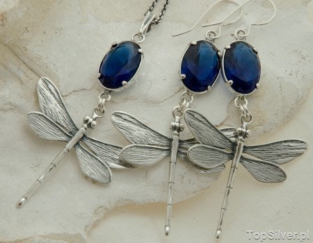 Przedstawiamy piękne srebrne kolczyki wraz z wisiorkiem. Ważki będące symbolem secesji zostały podkreślone poprzez dodanie pięknie połyskującego szafira. Taki zestaw świetnie się prezentuje i posiada magię przyciągania spojrzeń. Jest to doskonały pomysł na prezent.