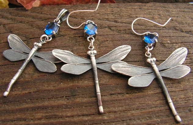 Srebrny komplet ważek – symbol secesji a także hit popularności. Ważki połączone zostały z pięknym szafirem(syntetycznym) zakutym w srebrną oprawę.