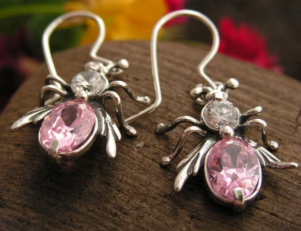Niezwykle urokliwe i oryginalne kolczyki przedstawiające filigranowe muchy, w których odwłok wkomponowano malutki kryształ Swarovskiego oraz 1karatowy kryształ Swarovskiego.