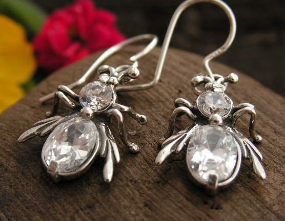 Niezwykle urokliwe i oryginalne kolczyki przedstawiające filigranowe muchy, w których odwłok wkomponowano malutki kryształ Swarovskiego oraz 1karatowy kryształ Swarovskiego.