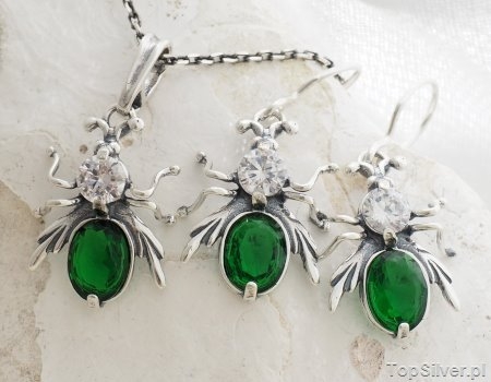Niezwykle urokliwy i oryginalny zestaw biżuterii w składzie: kolczyki i wisiorek. Przedstawiające filigranowe muchy, w których odwłok wkomponowano malutki kryształ Swarovskiego oraz 1karatowy szmaragd.