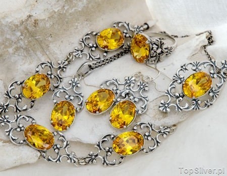 Stylowy zestaw biżuterii, który swój piękny wzór zawdzięcza rozkwitowi jubilerstwa w carskiej Rosji. W niepowtarzalny ornament wkomponowany jest ogromny cytryn złocisty.