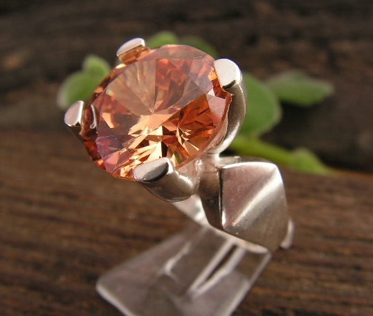 Efektowny srebrny pierścień, w którego masywne pazury zakuty zostały ogromny topaz złocisty – syntetyczny.