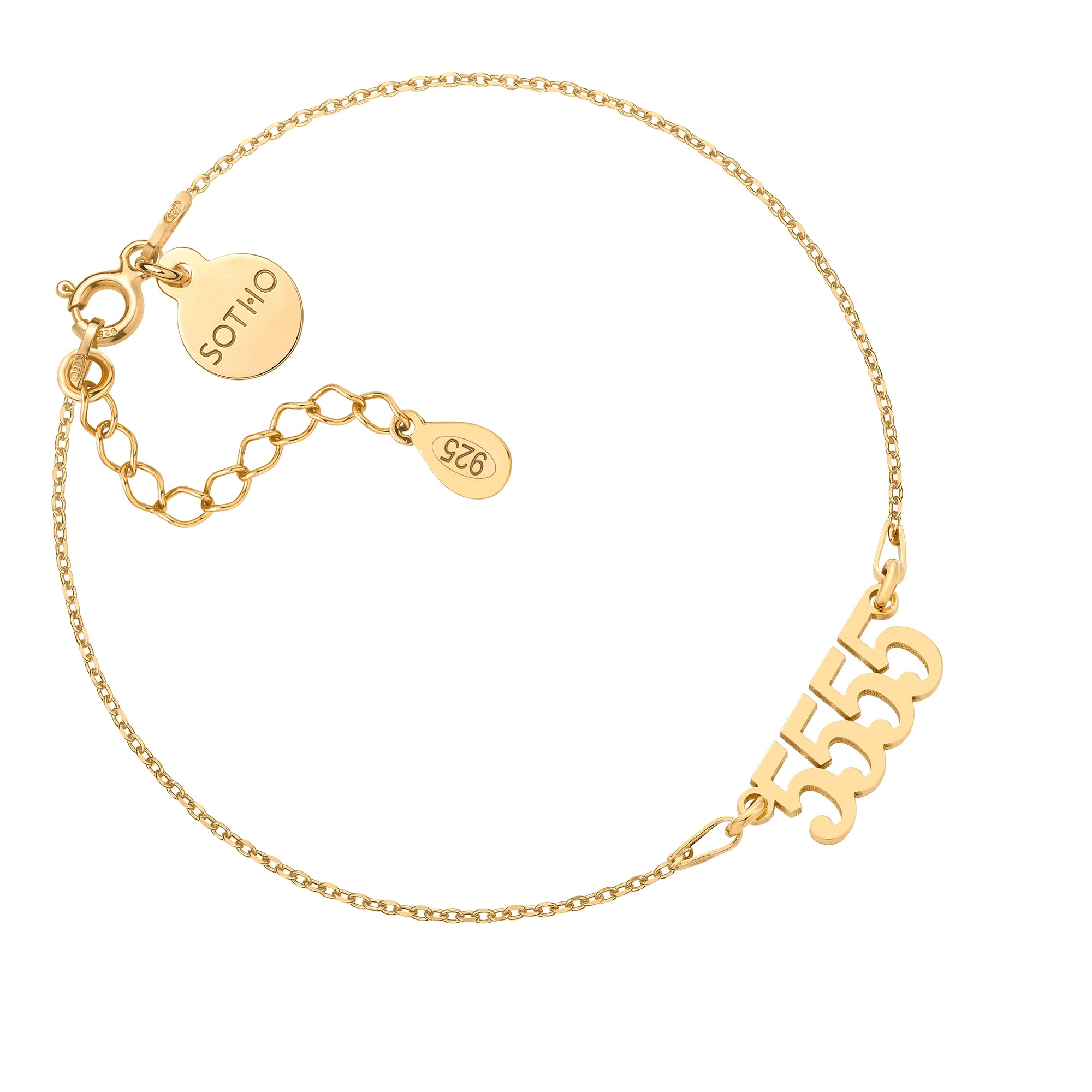 Złota bransoletka z liczbami anielskimi i logo marki. Całość wykonana ze srebra 925 powlekanego 24 karatowym żółtym złotem.