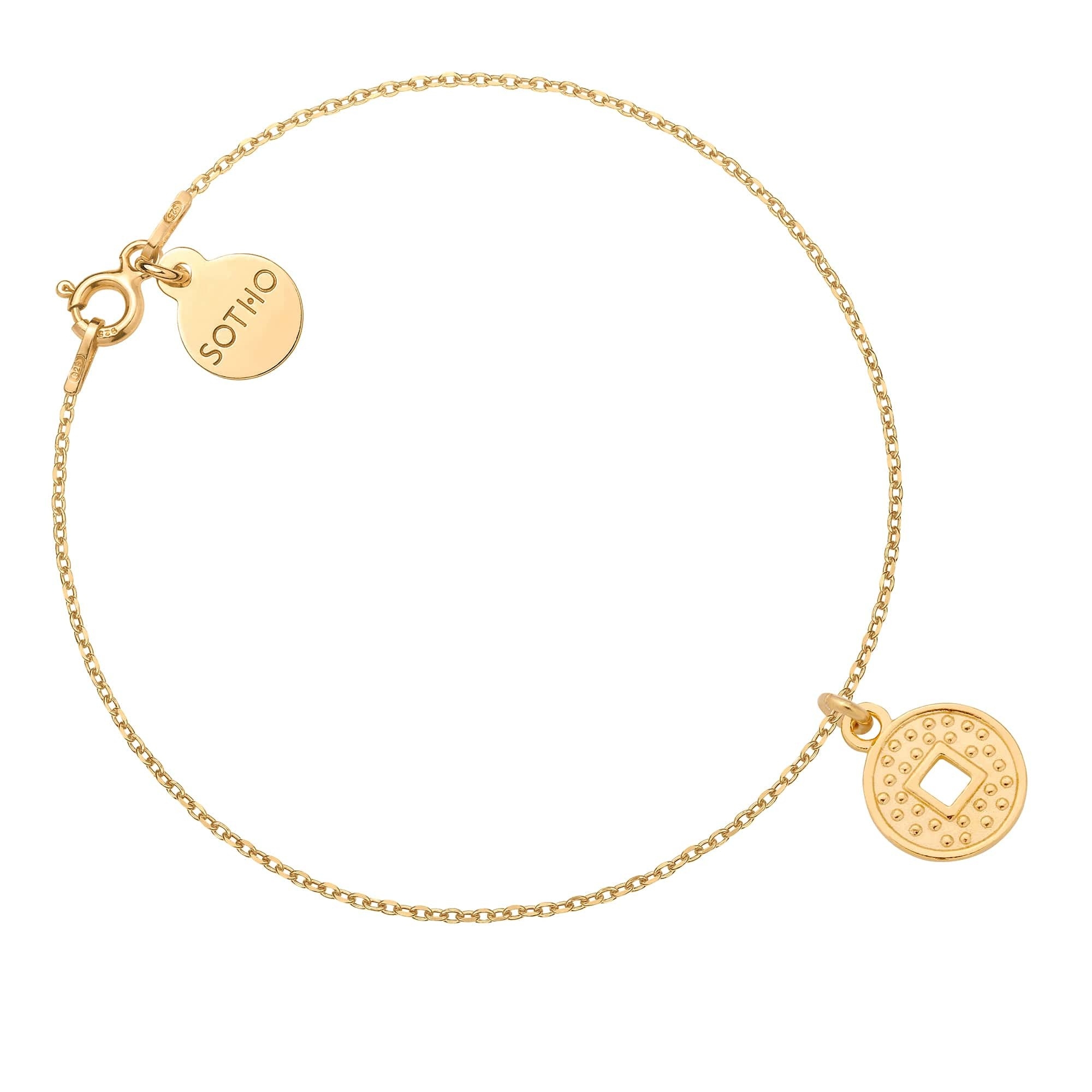 Złota bransoletka łańcuszkowa z monetą i zawieszką z logo marki. Całość wykonana ze srebra 925 powlekanego 24 karatowym żółtym złotem.