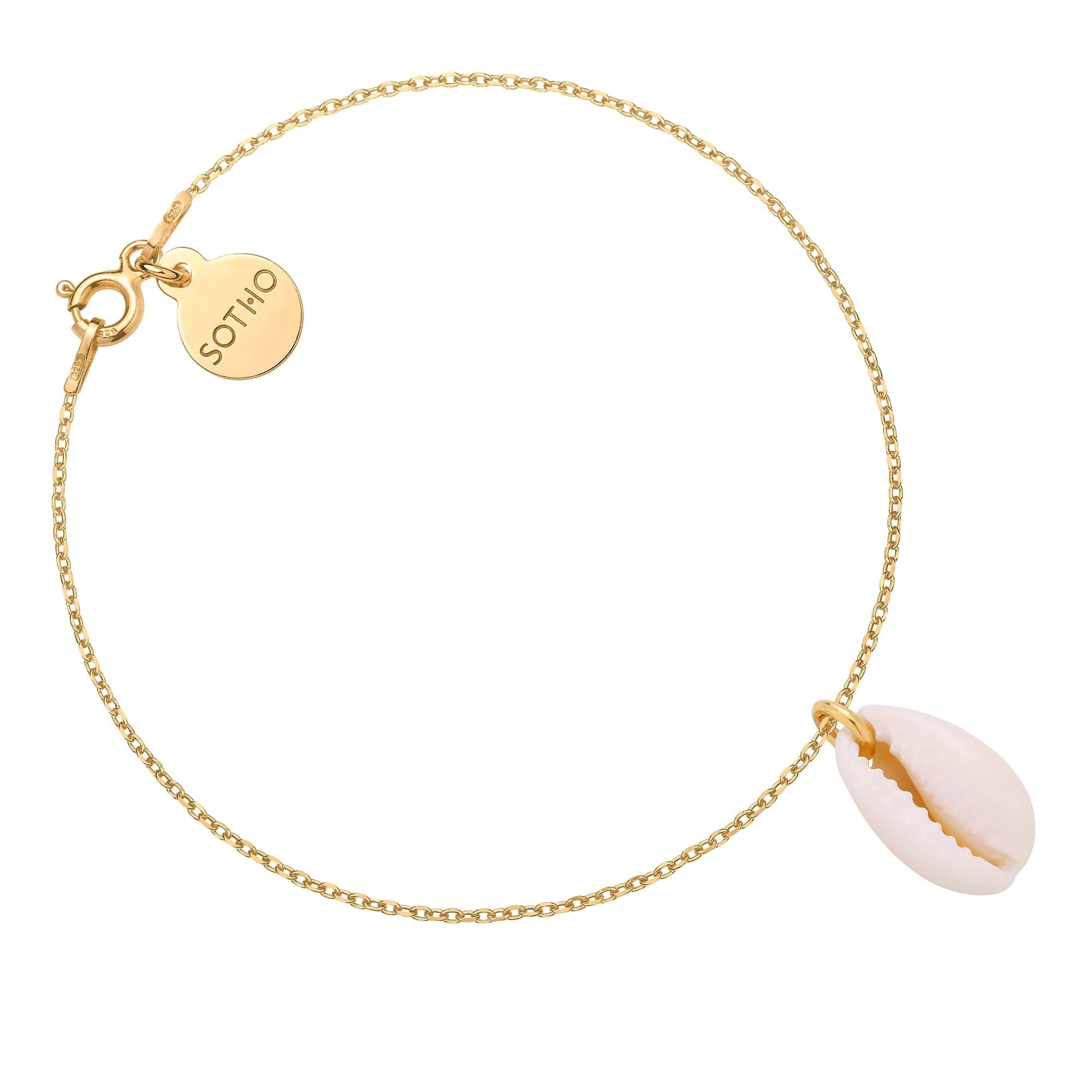 Złota bransoletka łańcuszkowa zdobiona muszelką i zawieszką z logo marki. Całość wykonana ze srebra 925 powlekanego 24 karatowym żółtym złotem.