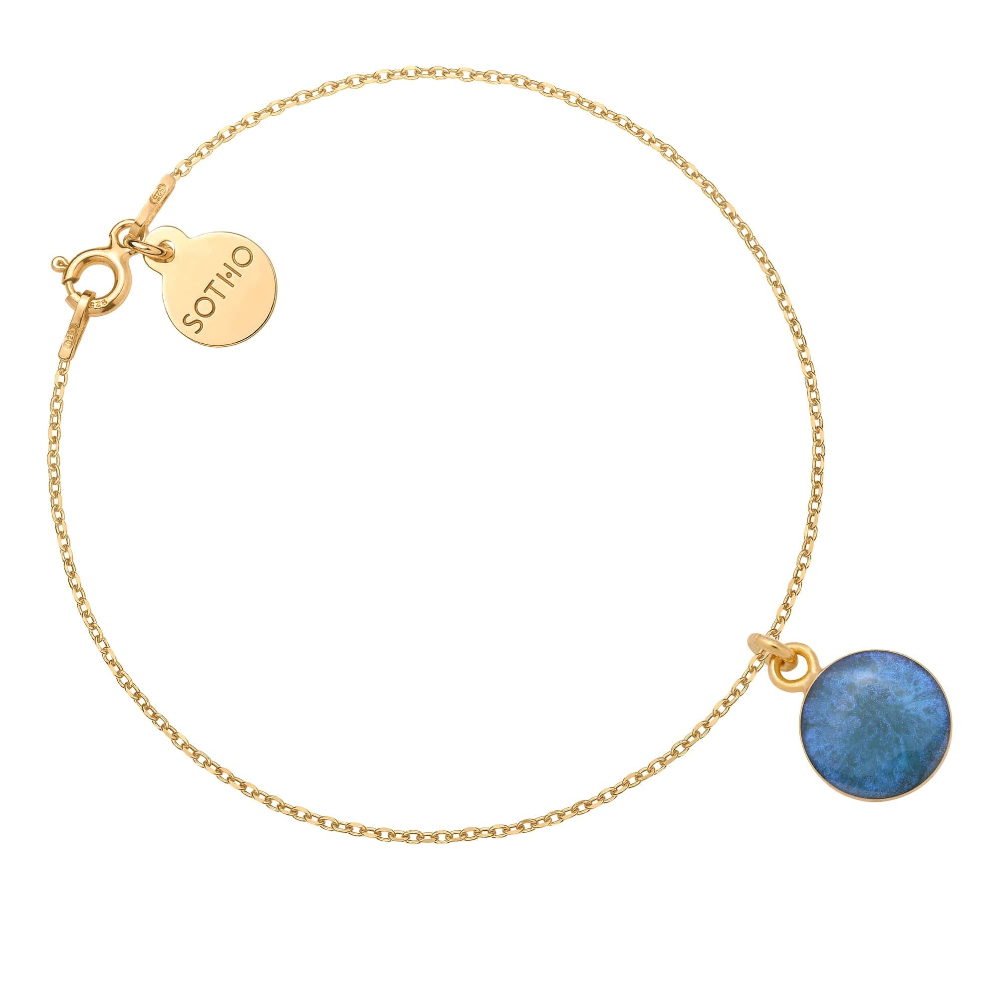 Złota bransoletka łańcuszkowa z turkusową żywicą i zawieszką z logo marki. Całość wykonana ze srebra 925 powlekanego 24 karatowym żółtym złotem.