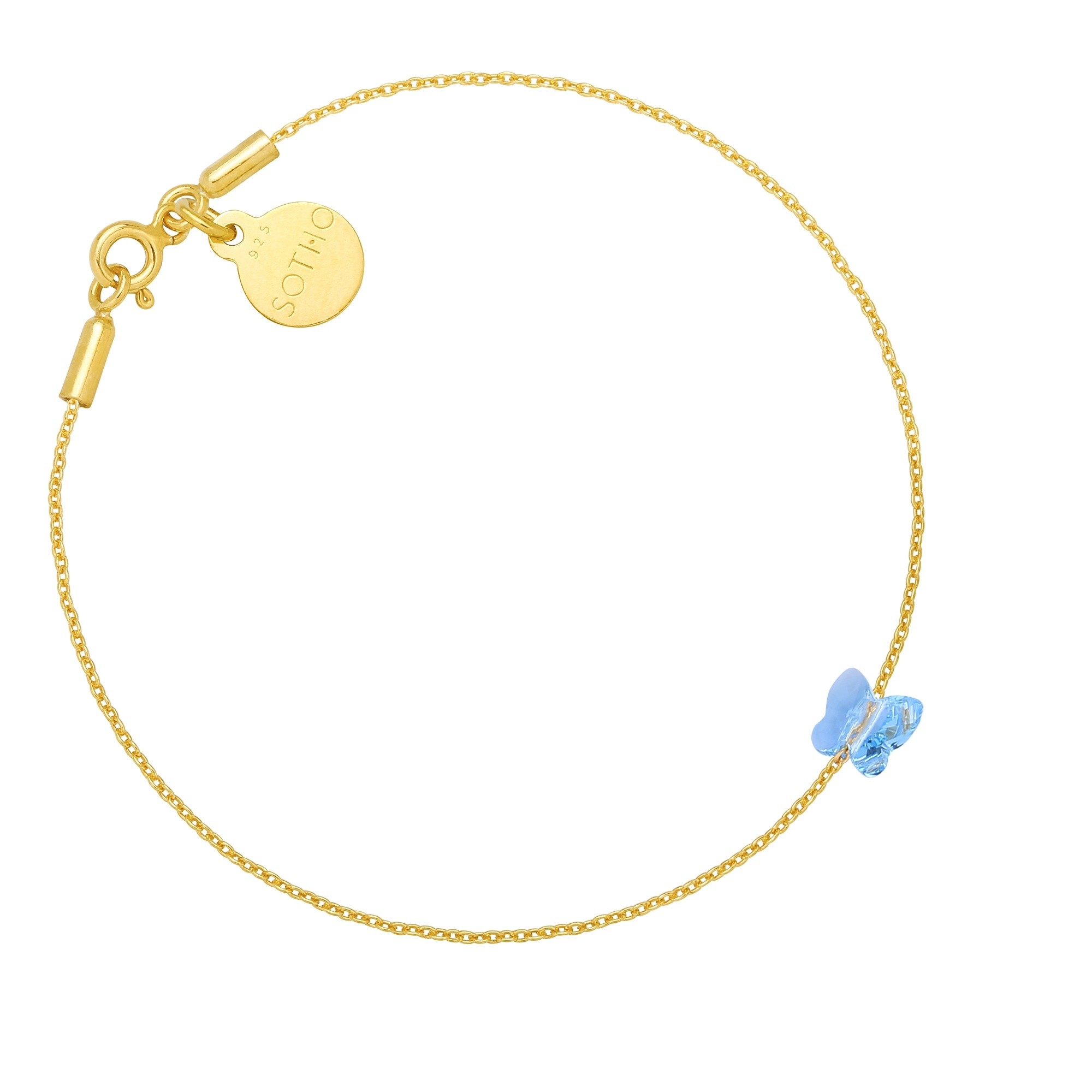 Złota bransoletka łańcuszkowa, zdobiona kryształowym motylkiem SWAROVSKI® ELEMENTS w kolorze niebieskim Light Turquoise i zawieszką z logo marki. Całość wykonana ze srebra 925 powlekanego 24 karatowym złotem.