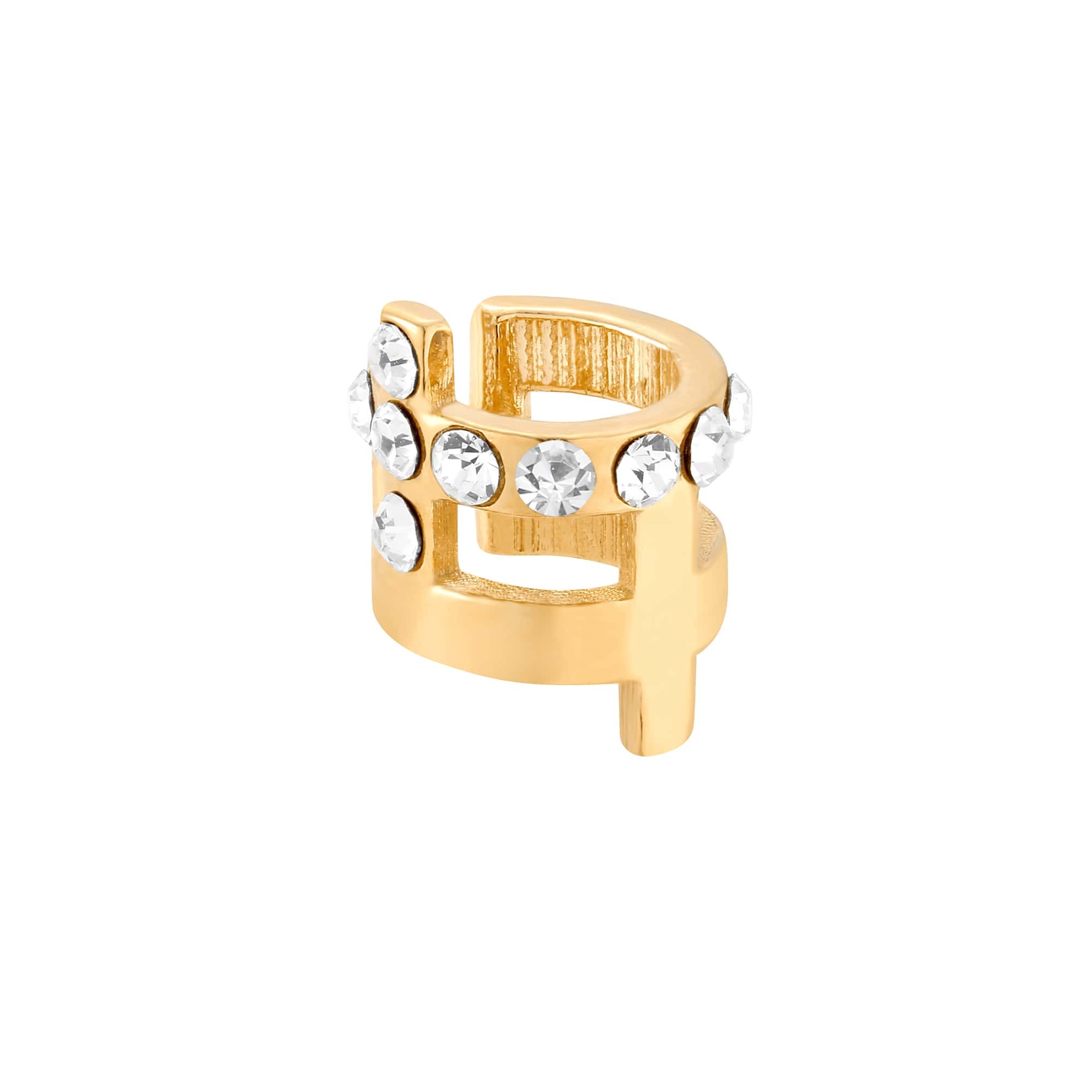 Złota nausznica zdobiona bezbarwnymi kryształami w całości wykonana ze srebra 925 powlekanego 24 karatowym żółtym złotem.